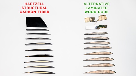 As we know, thicker airfoils produce more drag in flight. Because carbon fiber is up to 10 times stronger than spruce and beech wood cores selected by other propeller manufacturers, Hartzell is able to design wider, thinner aerodynamic airfoils that can still bear the structural load required for optimum aircraft operations. Some of Hartzell’s most popular designs include their swept-tip scimitar blade, optimized to yield more thrust and deliver better acceleration and climb performance.